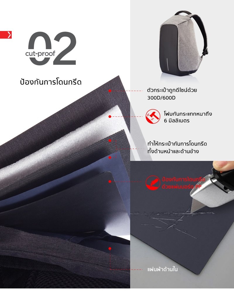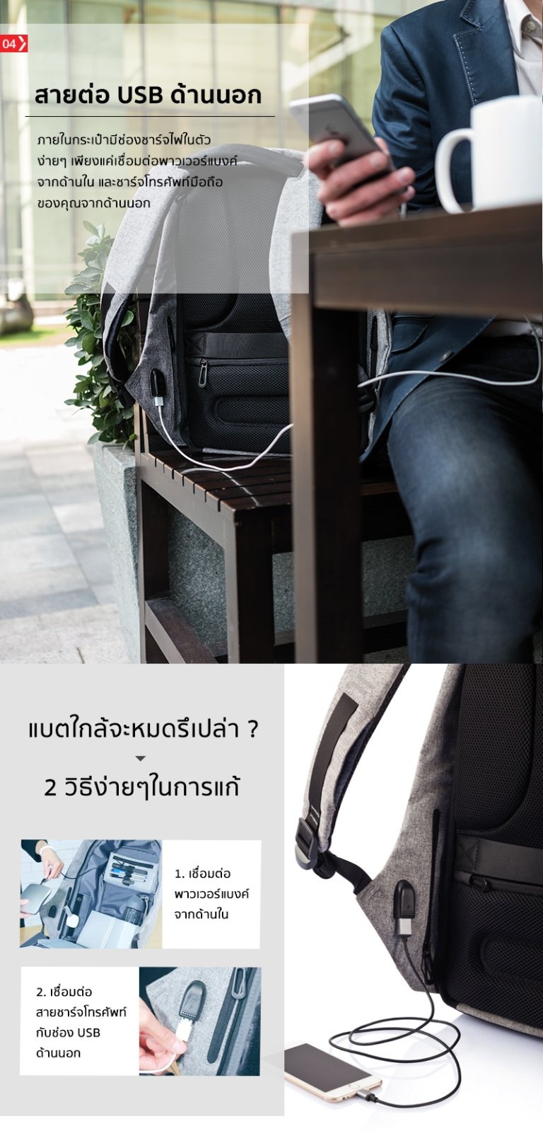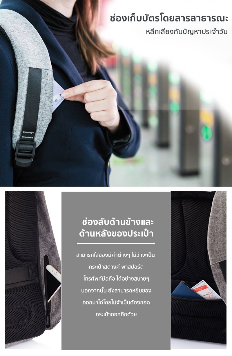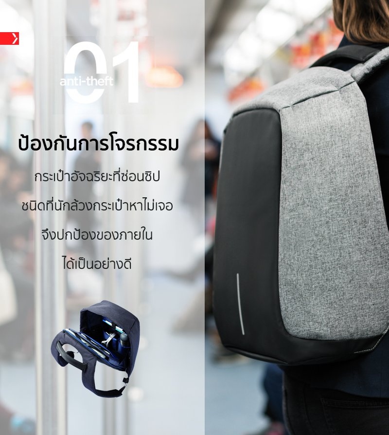 XD Design กระเป๋าเป้นิรภัยแล็ปท็อป Bobby Bag (สีเทา)Bobby, The best Anti-Theft Backpack ทุกๆวันมีการล้วงกระเป๋าถึง 400,000 ครั้งทั่วโลก แต่ต่อไปนี้คุณไม่ต้องกังวลอีกต่อไป เมื่อใช้กระเป๋าเป้ Bobby ที่ออกแบบมาอย่างดีเพื่อป้องกันการล้วงกระเป๋า ด้วยวัสดุคุณภาพที่ป้องกันการกรีดกระเป๋า อีกทั้งยังมีซิบและช่องลับที่ออกมาแบบมาอย่างพิถีพิถันเพื่อช่วยให้ซ่อนของมีค่าของคุณอย่างปลอดภัย ด้านข้างของกระเป๋ายังมีช่องเสียบ USB มีการออกแบบมาเพื่อทำให้กระเป๋าสมดุล เพื่อการใช้งานที่สะดวก ทั้งวัสดุที่กันน้ำ และด้านหน้าจะมีสัญลักษณ์เป็นขีดเส้นตรงซึ่งสามารถเรืองแสงได้ช่วยเพิ่มความปลอดภัยในยามค่ำคืน กระเป๋าจะมีสีให้เลือกด้วยกัน ถึง 2 สี คือ สีเทา และ สีน้ำเงินเข้ม